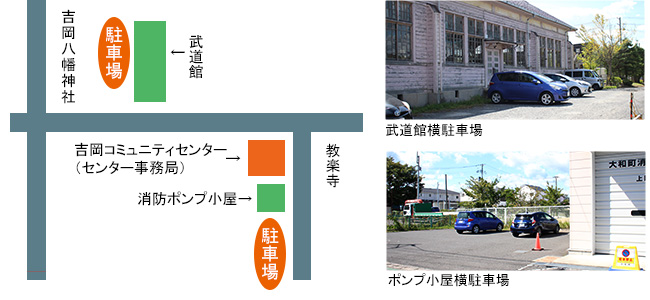 吉岡コミニュティーセンターの駐車場は教楽寺向かいにある消防ポンプ小屋横の駐車場、または武道館横の駐車場となっております。